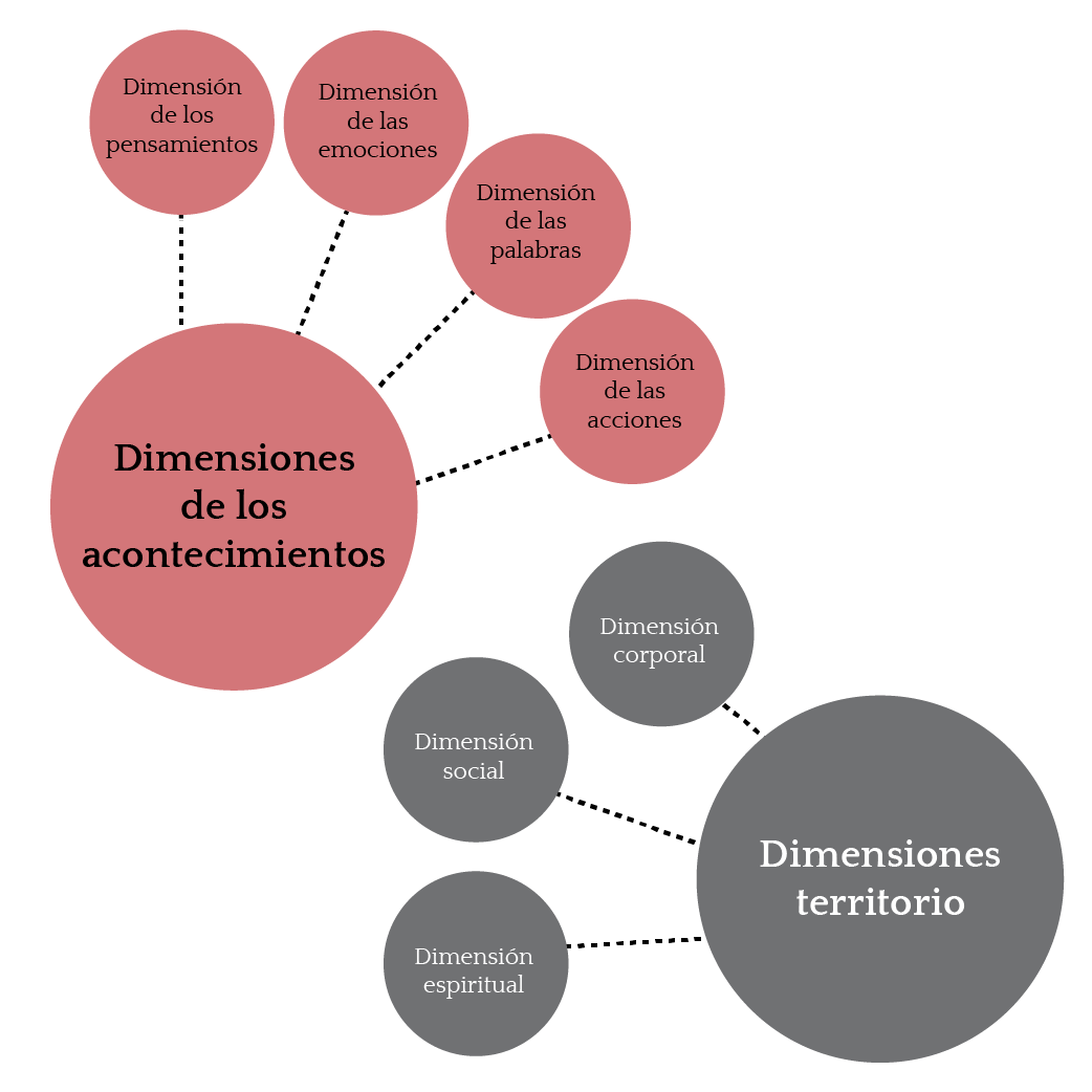 Lo corporal, lo social y lo espiritual, se presentan como dimensiones territorio, siendo el lugar donde se manifiestan los acontecimientos, las modificaciones y los cambios. Al mismo tiempo condicionan las posibilidades de despliegue de las primeras cuatro dimensiones.